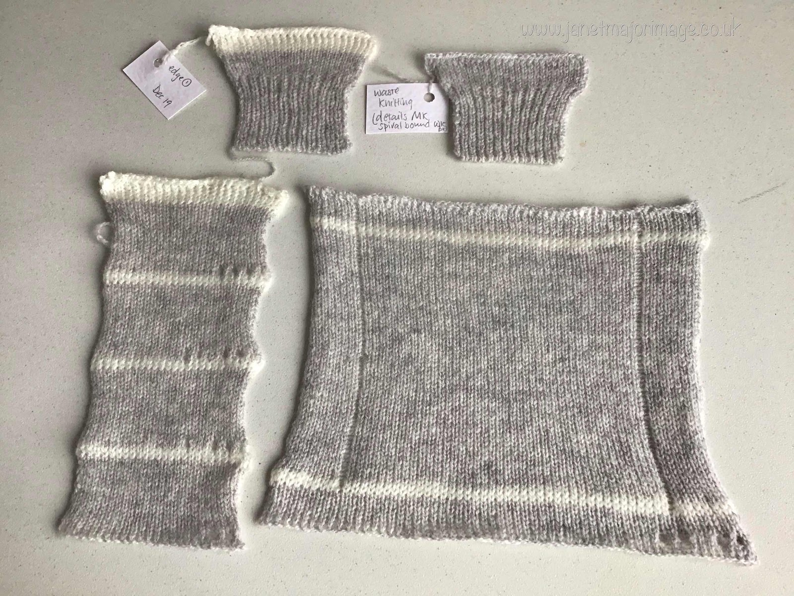 These are the samples I knit before I started. I was looking to get a good edge to the rib and a suitable tension. Hence the strip and then the square to get my measurements for stitches and rows per inch.